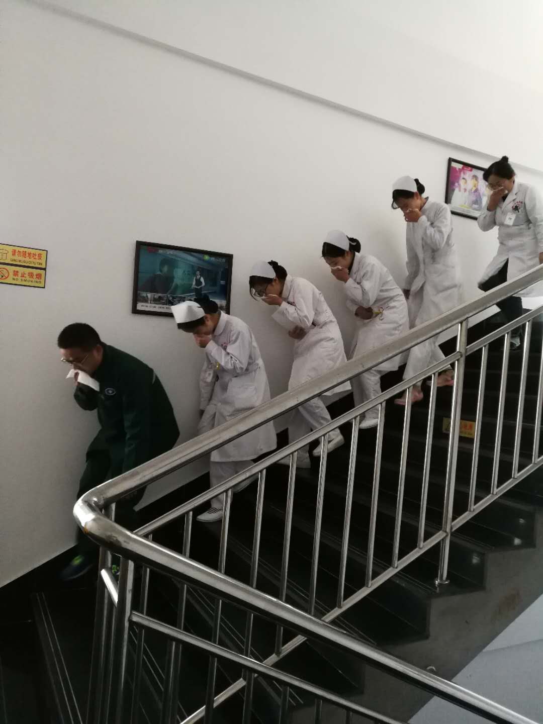 知识讲解完后还代领大家进行了火灾演习,用湿毛巾捂住口鼻,俯下身子从快速通道有秩序的逃离,逃离演习结束,在医院的空旷地做了干粉灭火器使用的演练,先将灭火器摇晃几下,然后拔保险销,左手握着喷管,右手提着压把,在距火焰两米的地方,右手用力压下压把,左手拿着喷管左右摇摆,喷射干粉覆盖燃烧区,直至把火全部扑灭。此过程看似简单,真正到发生火灾时一定要牢记,如身边有干粉灭火器,做到小火及时扑灭,以免造成更大的灾祸。