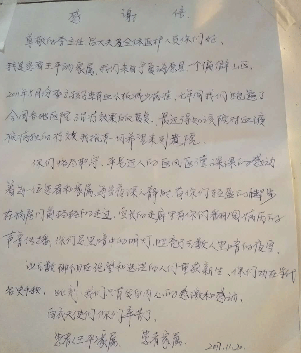 尊敬的李主任、吕大夫及全体医护人员你们好,我是患者王平的家属,我们来自宁夏海原县一个偏僻山区,2011年5月份查出孩子患有血小板减少症,七年间我们跑遍了全国各地医院,治疗效果反反复复,最近得知该院对血液病的独特疗效,我抱着一切希望来到贵院。