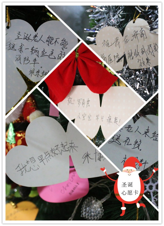 圣诞树的布置吸引了医院里的小患者们,他们积极的往圣诞树上挂小装饰品,并在护士阿姨分发的圣诞许愿卡上许下愿望,传递美好,希望圣诞老人能够帮忙实现自己的心愿。