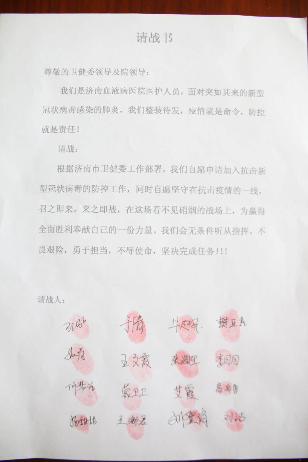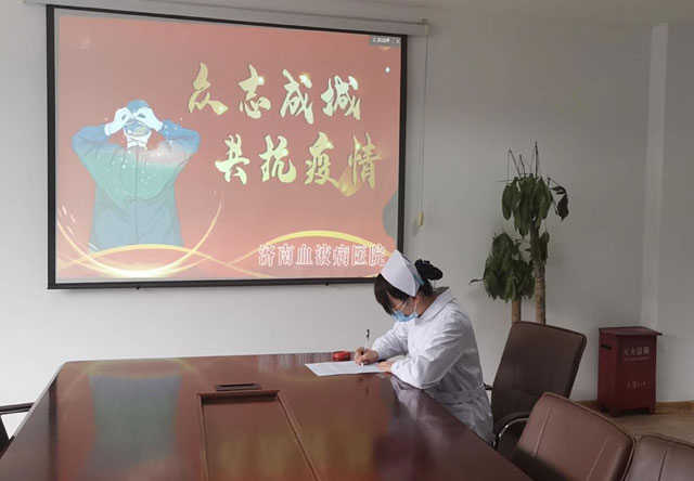 随着疫情防控工作的推进,截止目前,我院已有数十位医护人员主动请缨上阵,面对紧张、严峻的疫情防控工作,他们不但没有丝毫退缩,而且高昂的喊出“同时间赛跑、与病毒较量”的口号,以战时状态奋战在防控工作中,以实际行动切实守护广大血液病患者和人民群众的生命安全、身体健康,他们为这场疫情防控阻击战做出了积极贡献,他们团结勇敢、不畏病毒、坚持抗疫、永不退缩的精神充分体现了济南血液病医院医护人员的责任与担当。