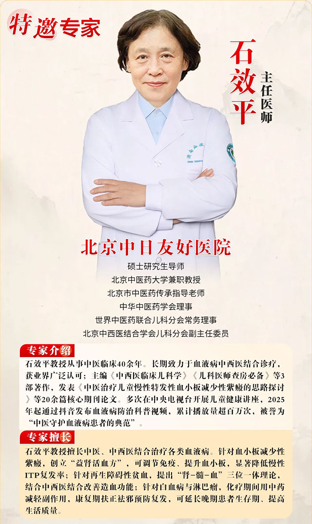 石教授将结合40余年临床经验,讲解中医药在血液病(紫癜、血小板减少、贫血、白血病等)治疗中的独特作用,以及中西医结合的最新理念。